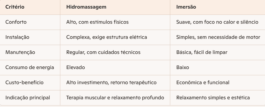 Já a banheira de imersão, também conhecida como banheira sem hidro, não possui sistema de jatos. Seu foco está no banho quente e prolongado, com água parada, oferecendo uma experiência mais silenciosa e contemplativa.